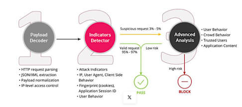 In stage 3, requests which are considered potentially malicious based on the indicators analysis which happened in stage 2 are further analyzed in the contextual machine learning evaluation engine, in order to gain the best-possible confidence that any HTTP request, which was indicated as being potentially malicious, is indeed an attack, and to rule out false positives effectively. To do this, open-appsec considers different additional contexts like the application structure, how users generally or individually interact with the content, and more. This evaluation is done with an online, non-supervised ML model, which is built and updated continuously in real-time for the specific, protected environment based on the inbound traffic.