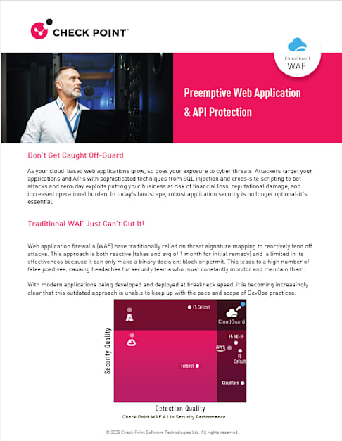 Check Point CloudGuard WAF This guide explores how CloudGuard WAF reimagines application security with preemptive threat prevention, precise risk scoring, and business-specific protection. Inside, you’ll discover how the solution embeds security directly into the CI/CD pipeline, automates API discovery, and protects against sophisticated bot attacks using advanced client-side behavioral analysis. With detailed insights into real-world use cases, deployment flexibility, and key benefits –including zero manual tuning, no signature updates, and near-elimination of false positives – this resource shows why CloudGuard WAF is a critical layer of defense for any modern application environment.
