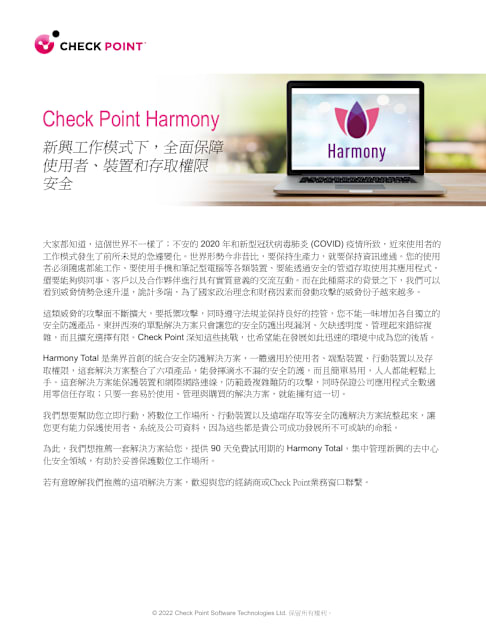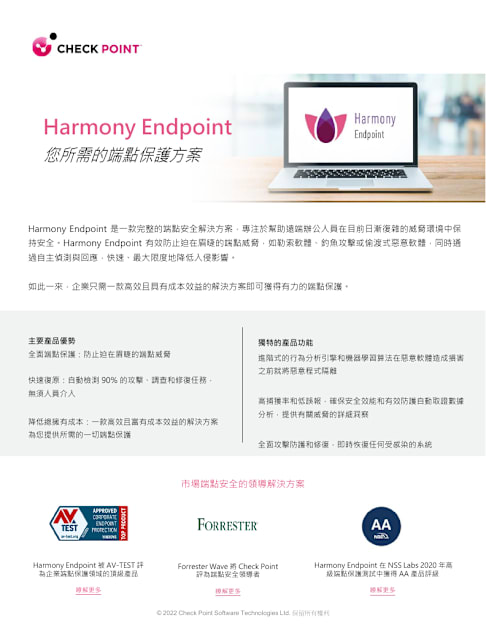Harmony Endpoint 是一款完整的端點安全解決方案,專注於幫助遠端辦公人員在當前日常變幻的威脅環境中保持安全。Harmony Endpoint 有效防止出現在端點上的威脅,例如間諜軟體、勒索攻擊或偷渡式惡意軟體,同時通過自主偵測和回應,快速且極大地減少入侵的影響。 因此,企業只需一個高效且具有成本效益的解決方案,即可獲得強大的端點保護。